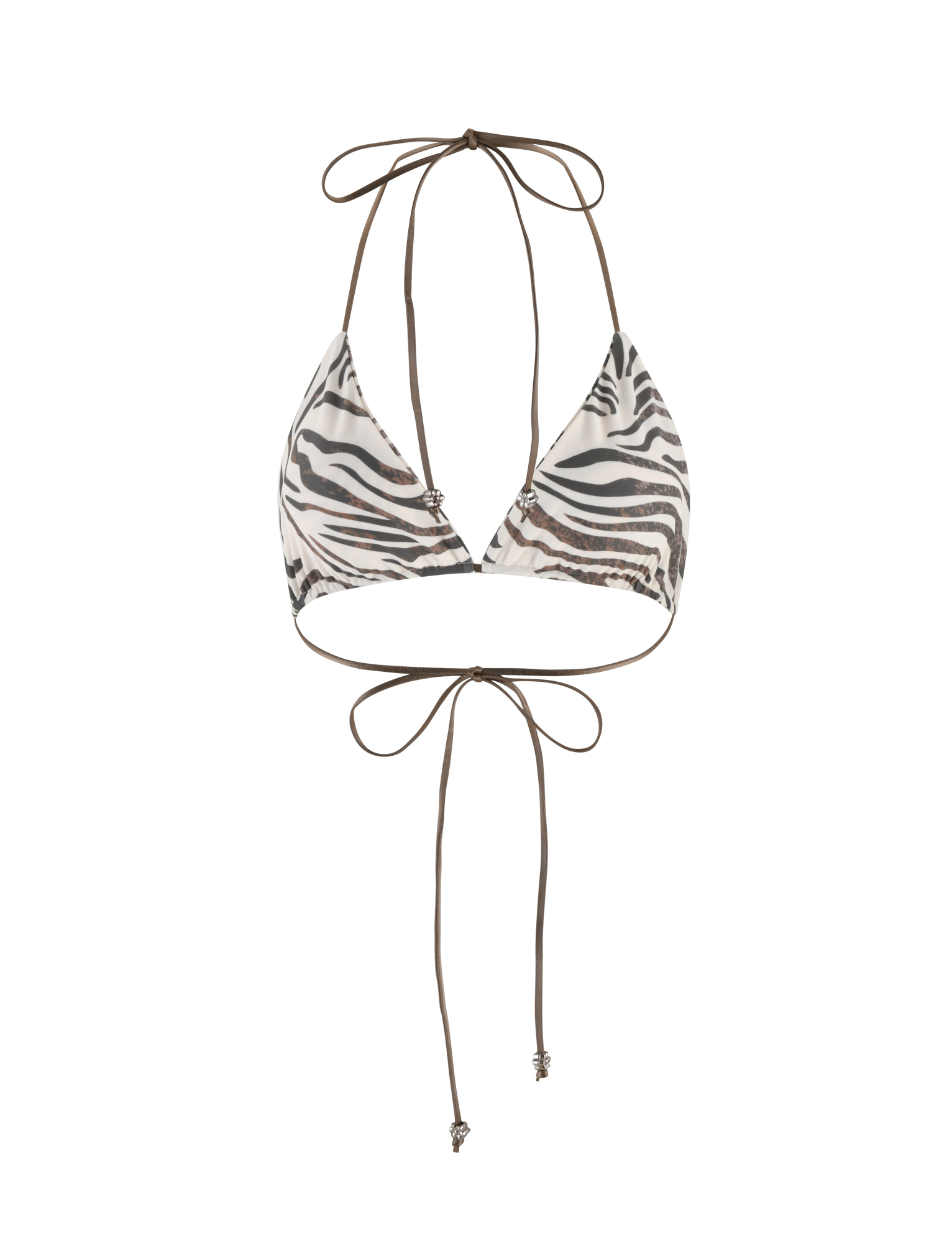Best-selling Ave Bikini Top in a new zebra print fabrication\nTrue-tie halter neck and back straps