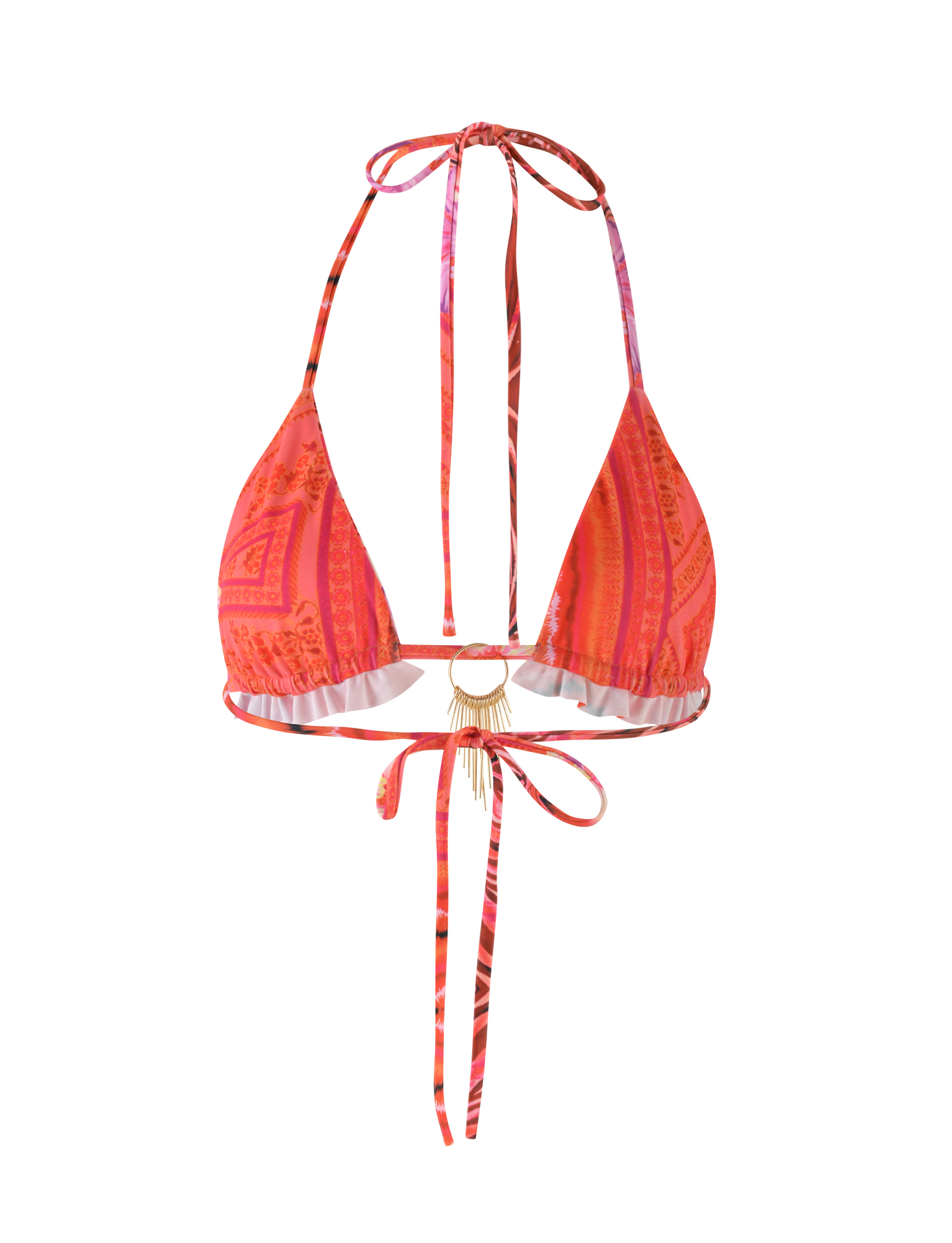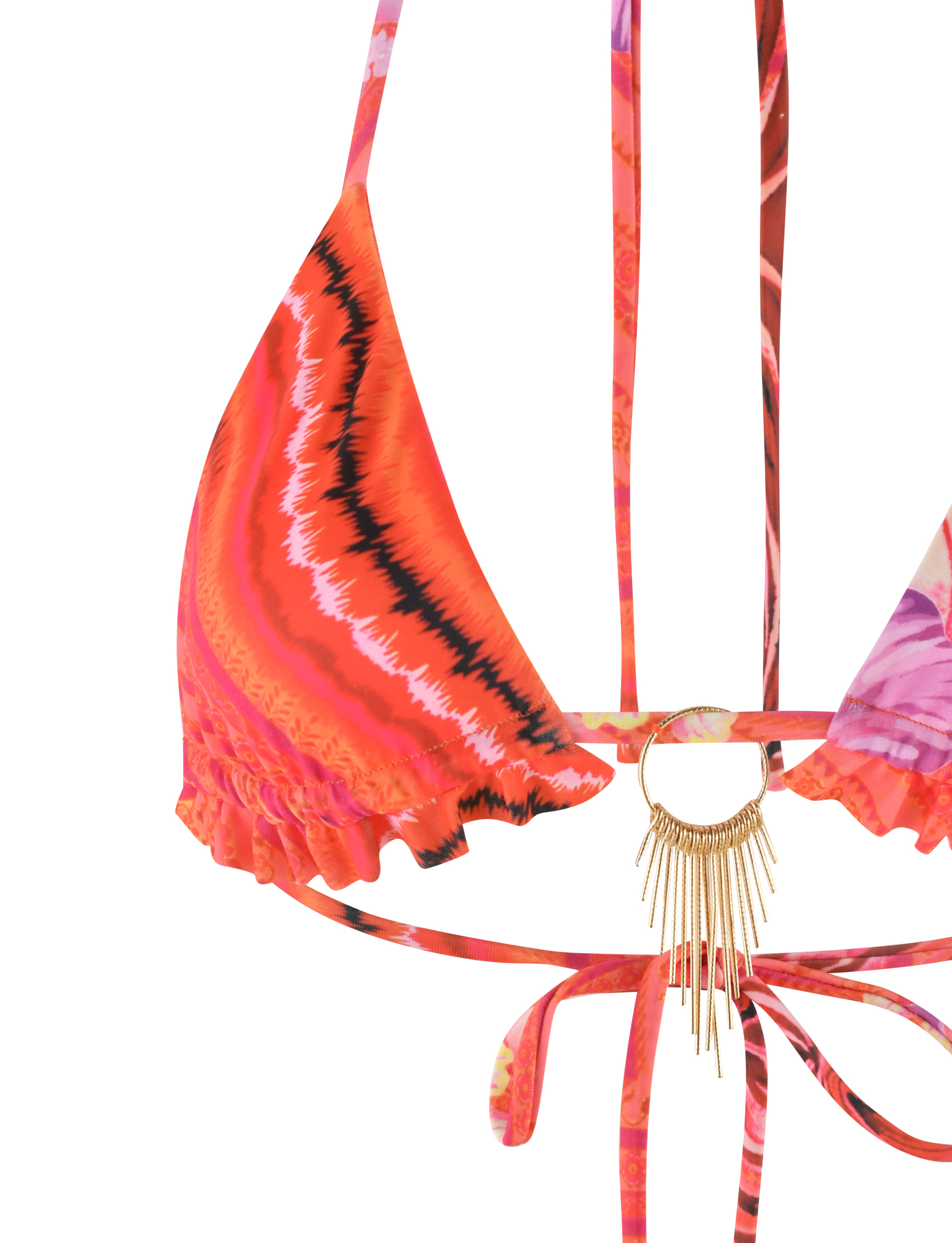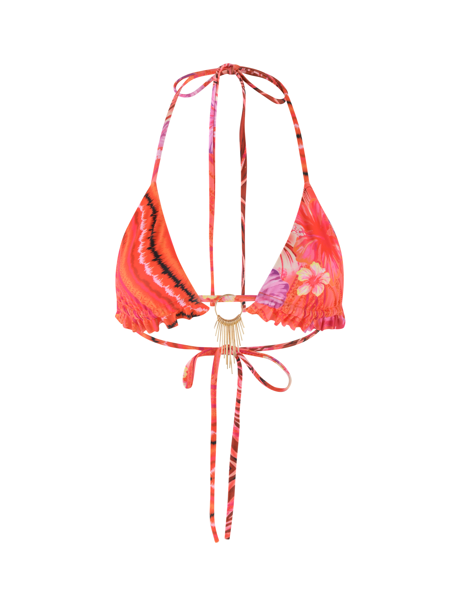 Ruched triangle bikini in bright pink tropical print with gold embellishment