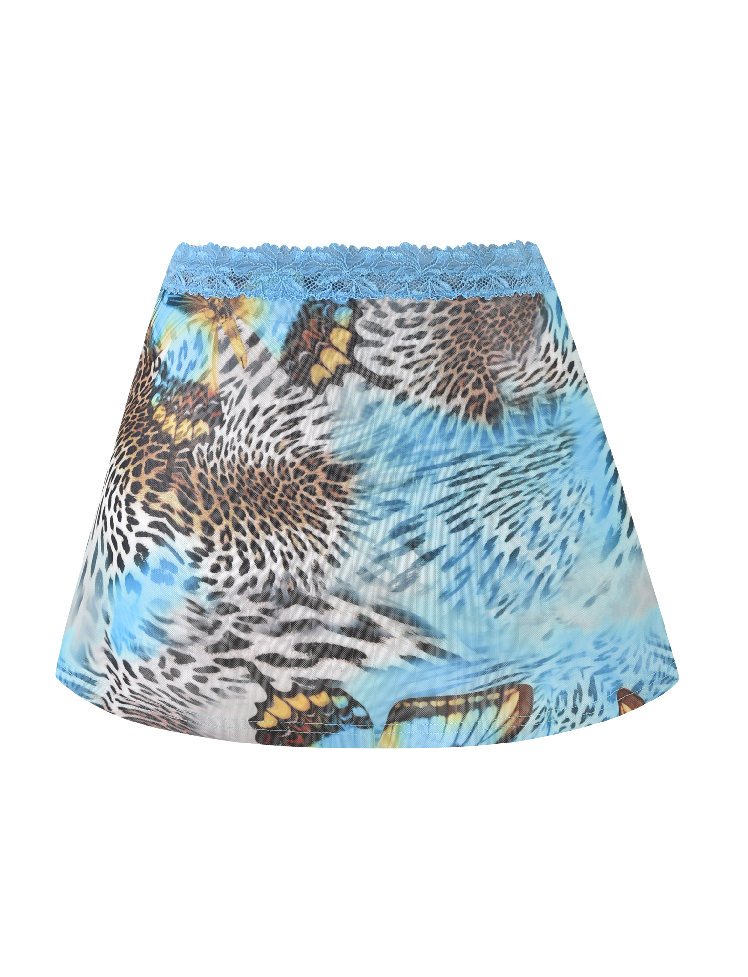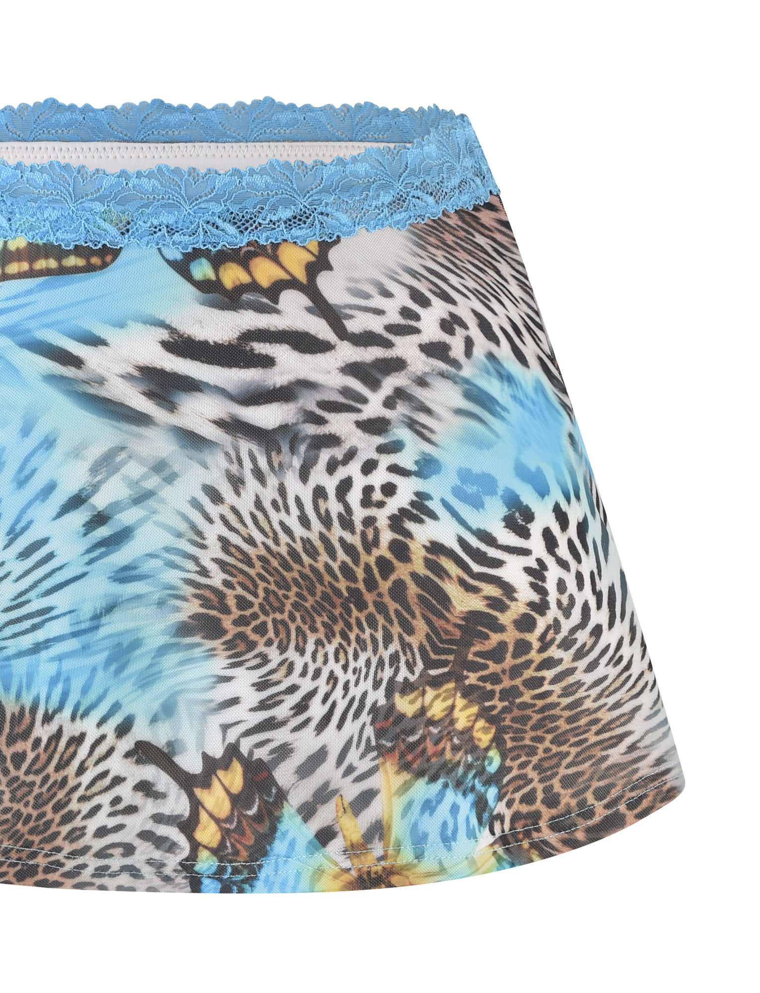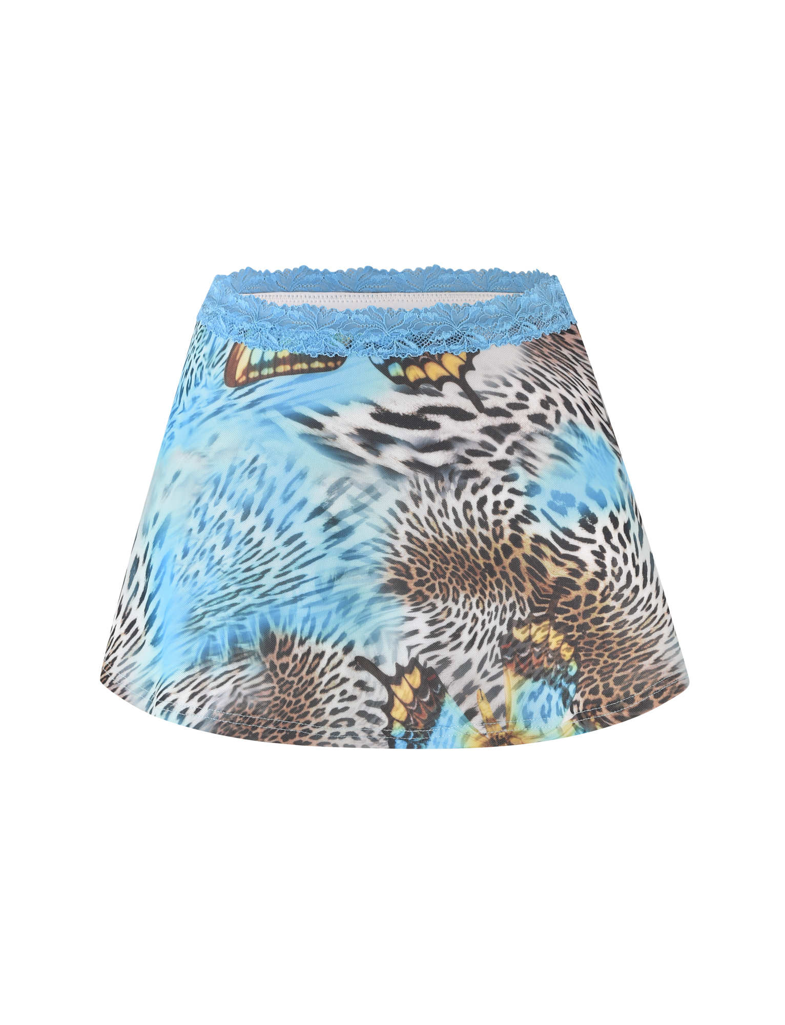 A-line mini skirt in new blue butterfly and animal print featuring a blue lace waist band