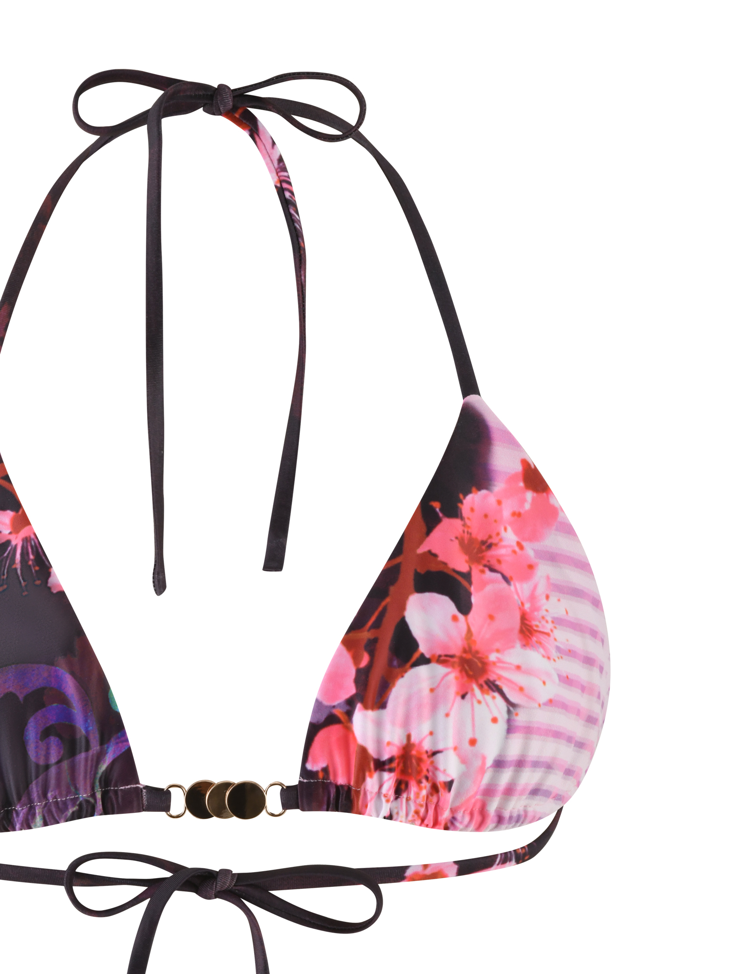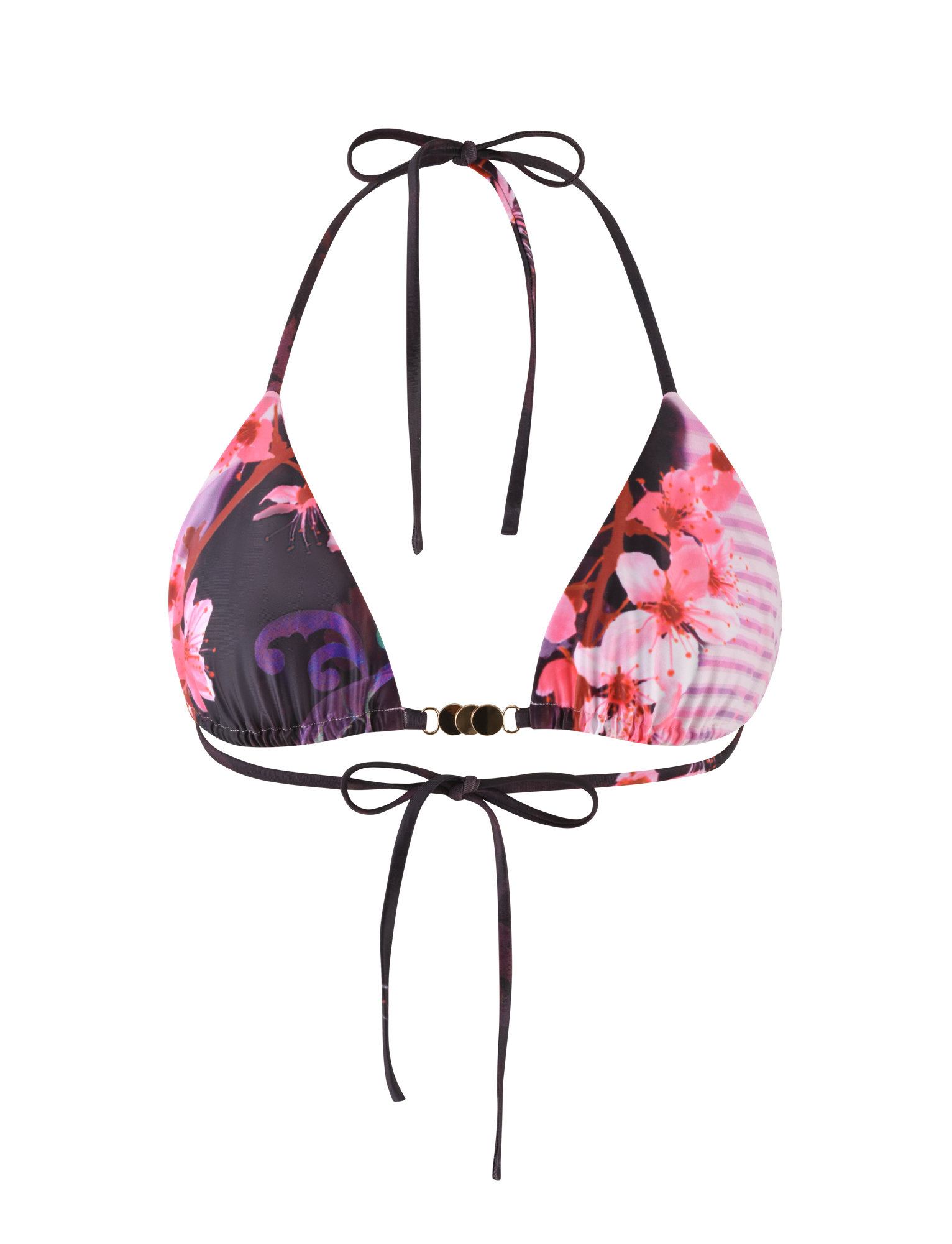 Brown and pink printed triangle bikini top made with our favorite slinky elastane