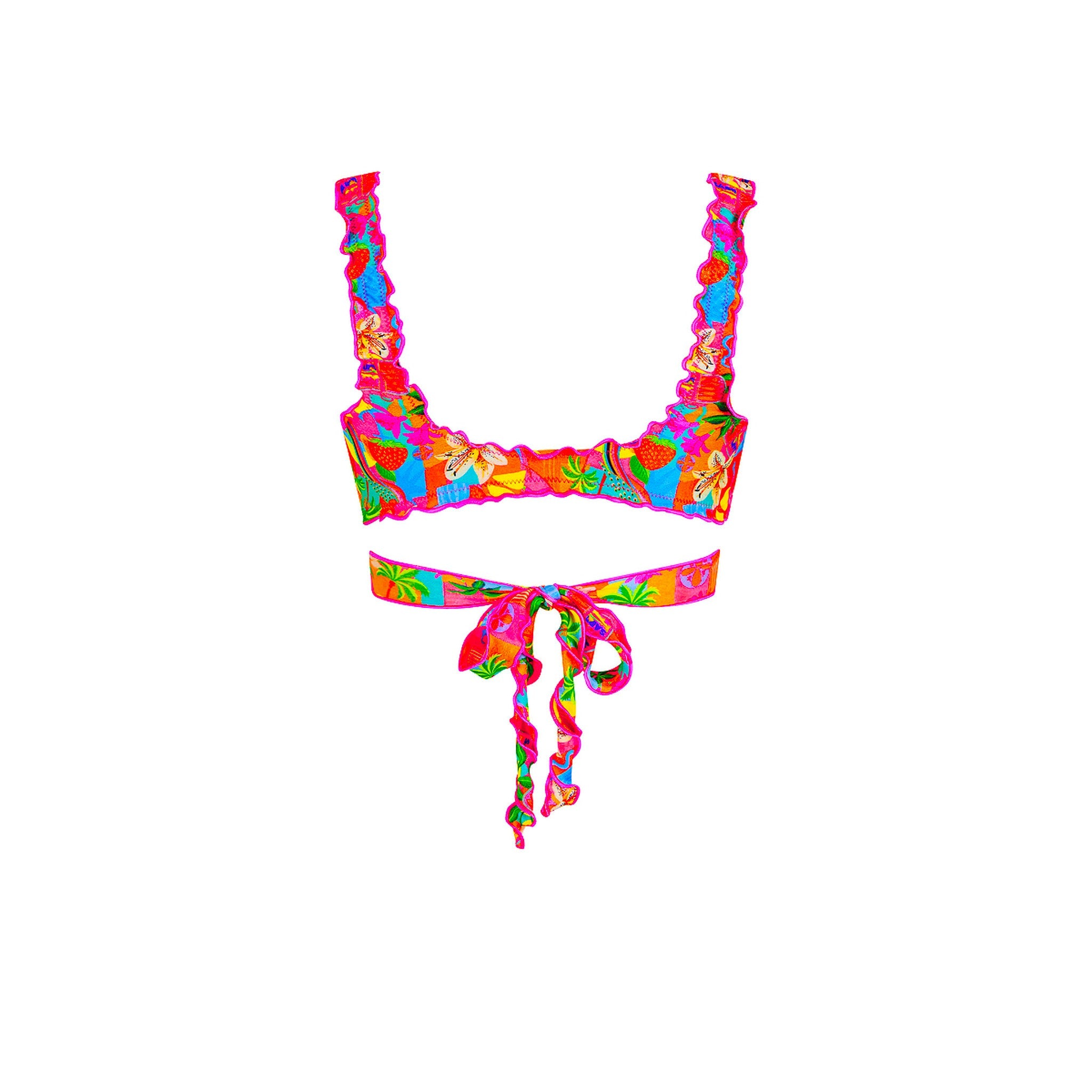 Our Lettuce Edge Wrap Bikini Top is a playful piece designed to make you feel like a beach goddess! Featuring the cutest wraparound details, it beautifully highlights the bust and cinches the waist for a flattering fit.