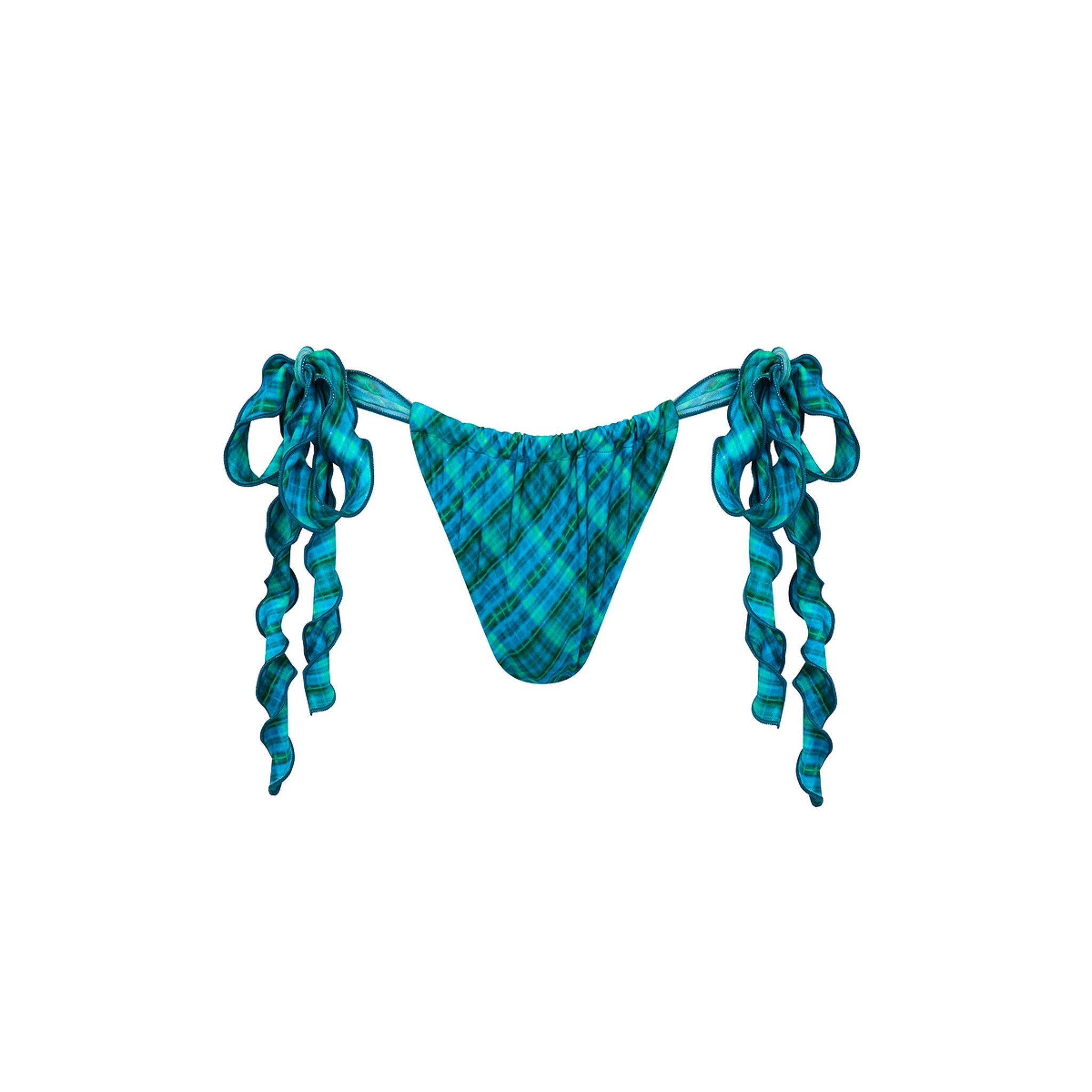 The 'Lettuce Tie Ruched Thong' bikini bottom lets you customise your coverage - from thong to cheeky or more modest. It's designed to sit high on the hips, and features textured lettuce edge side ties for an eye-catching detail.