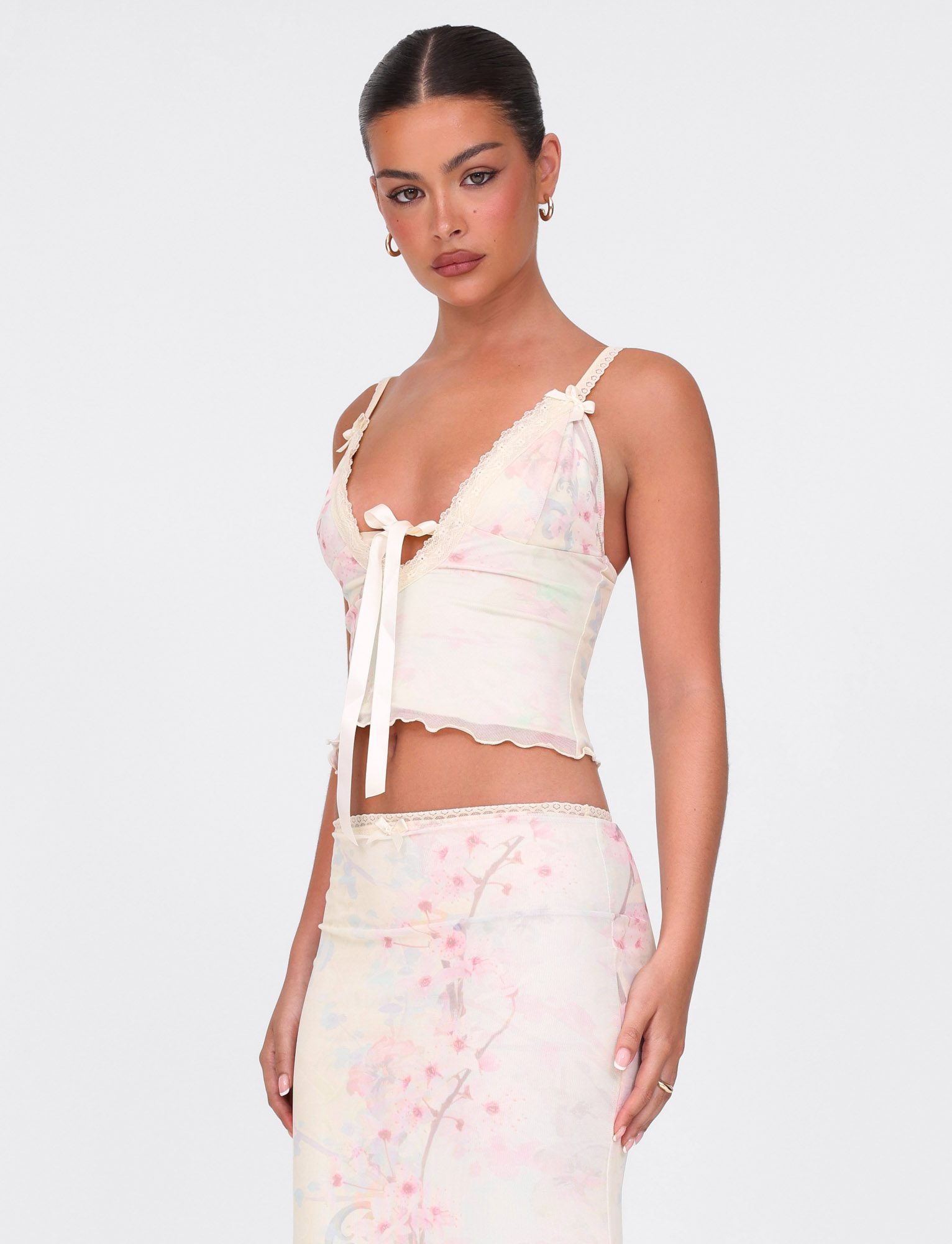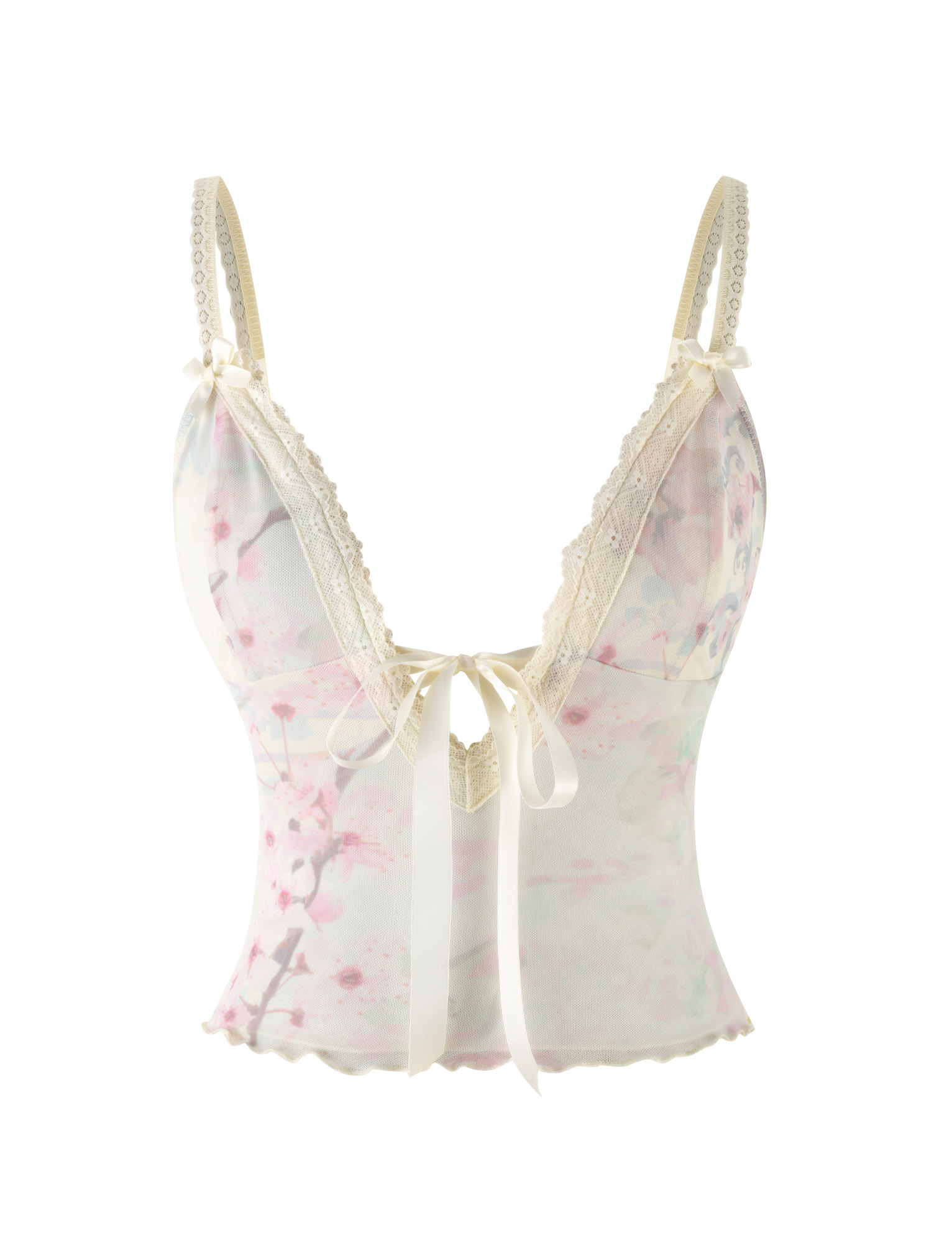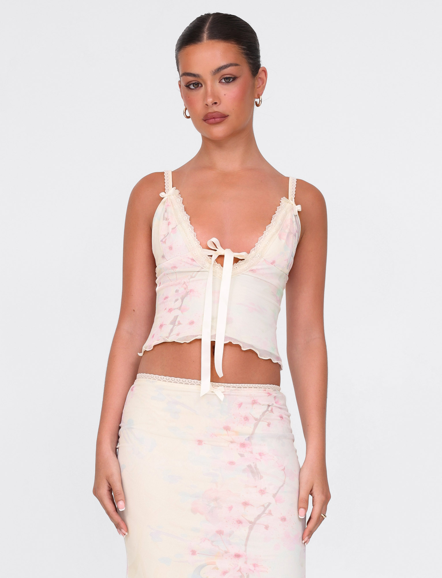 Cutesy singlet top in cherry blossom print with demure centre satin bow