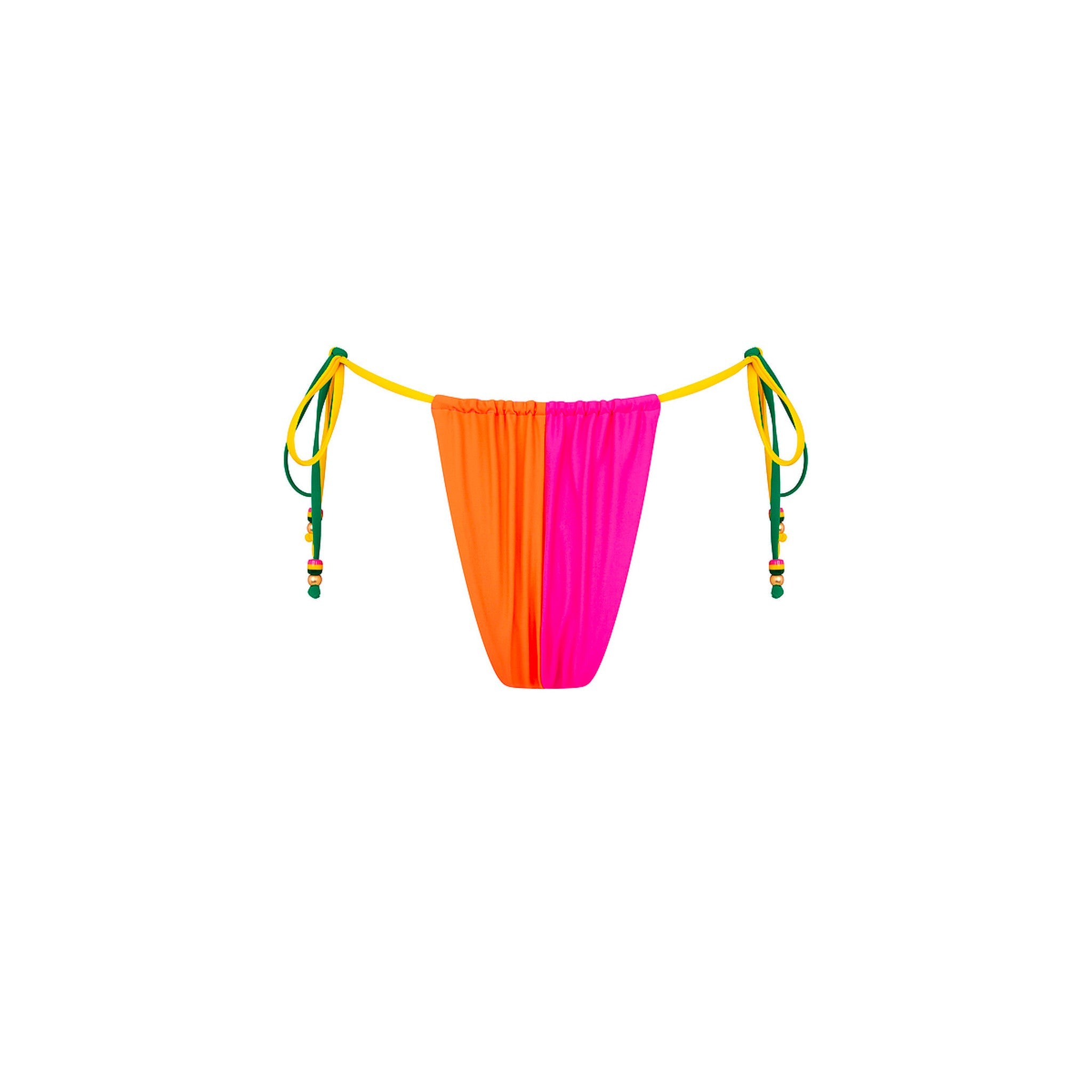 A fresh twist on a classic tie-side silhouette. This tie-side bikini bottom features a two-toned spliced panel design with gathered ruching and a dipped waist for a flattering fit.