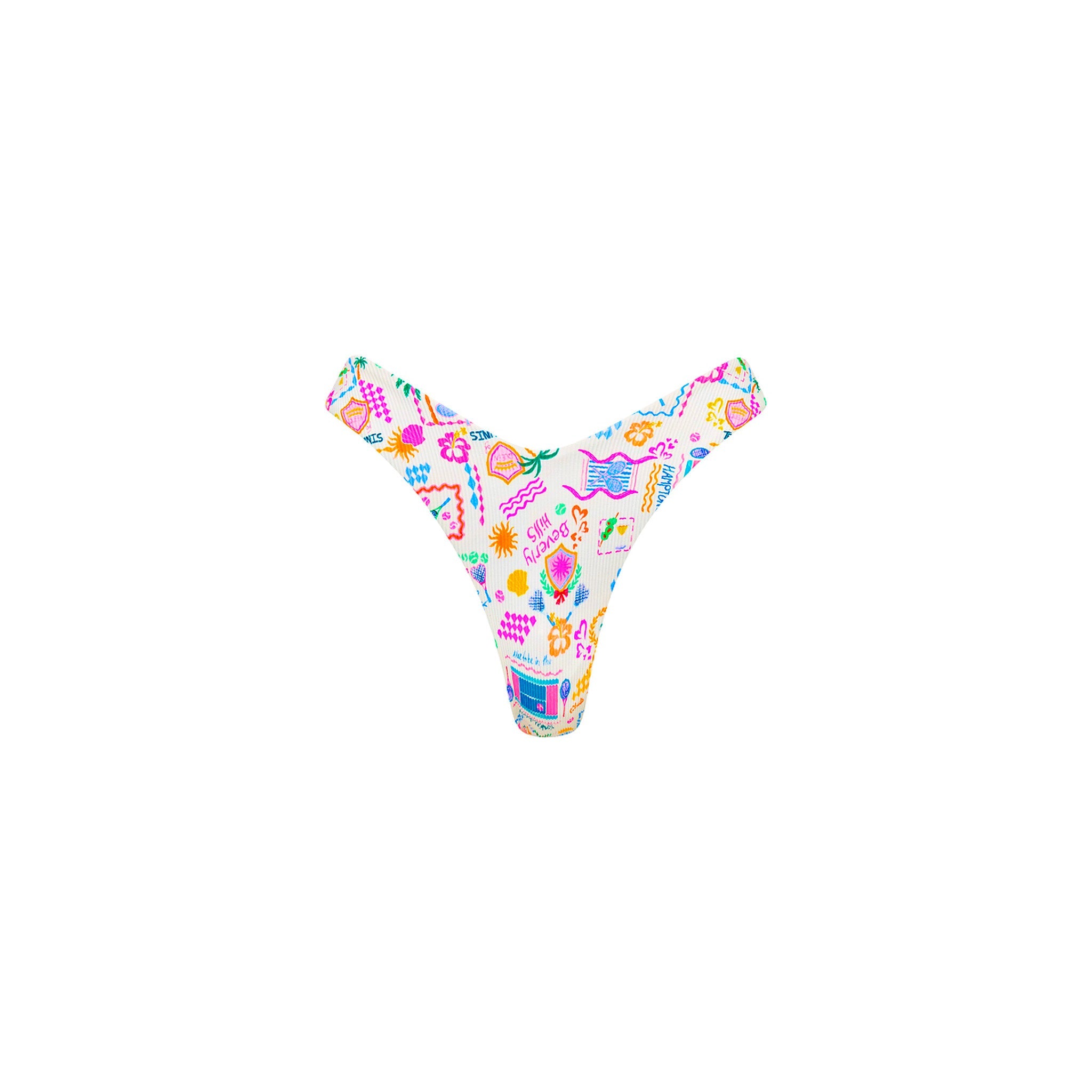 Fit runs small, we recommend sizing up if you are between sizes. Coverage is thong/brazilian and style is low to mid rise.